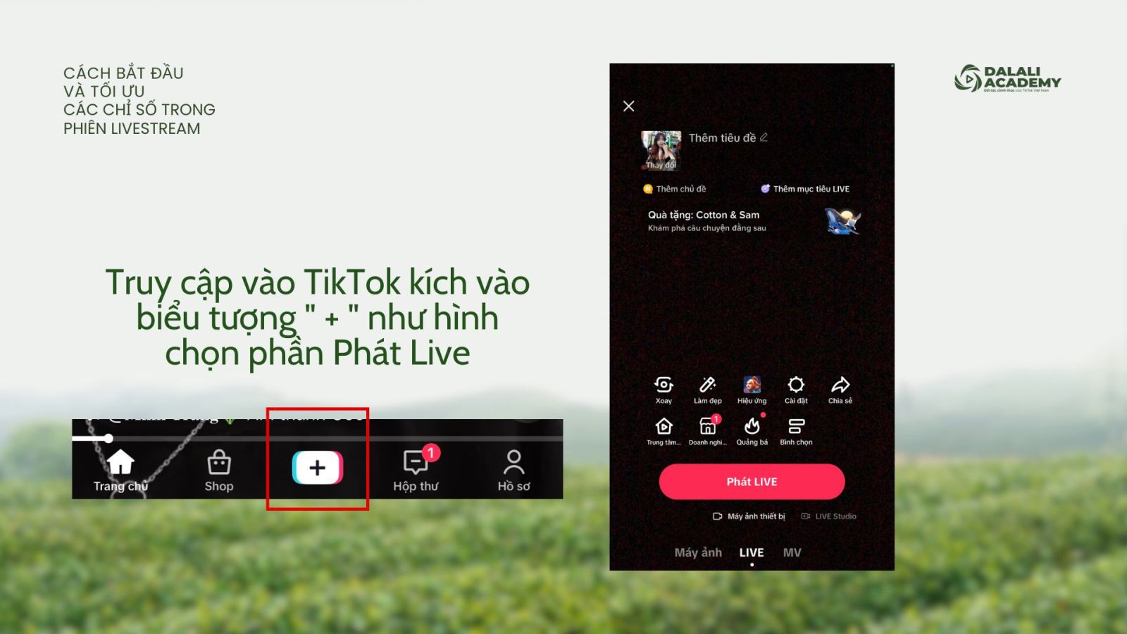 Đối với các tài khoản TikTok đã đủ các điều kiện như trên, đây là cách để bật phát Livestream ngay trên ứng dụng. (Tài liệu thuộc về phòng đào tạo Dalali Academy)